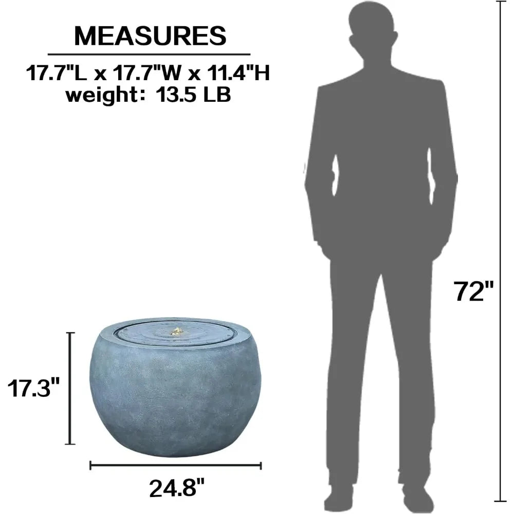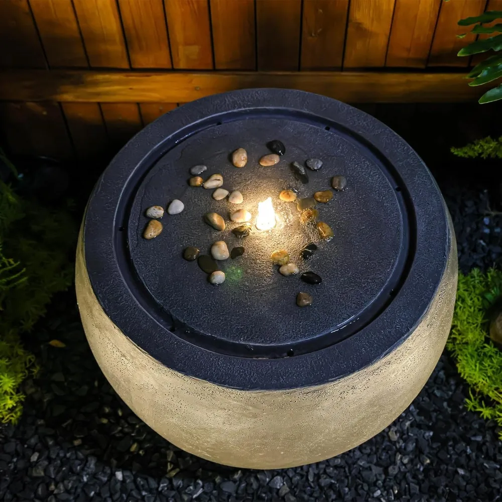 - The spherical resin fountain features a faux concrete finish and integrated lights that illuminate the water, enhancing ambiance in gardens, courtyards, or indoor spaces.