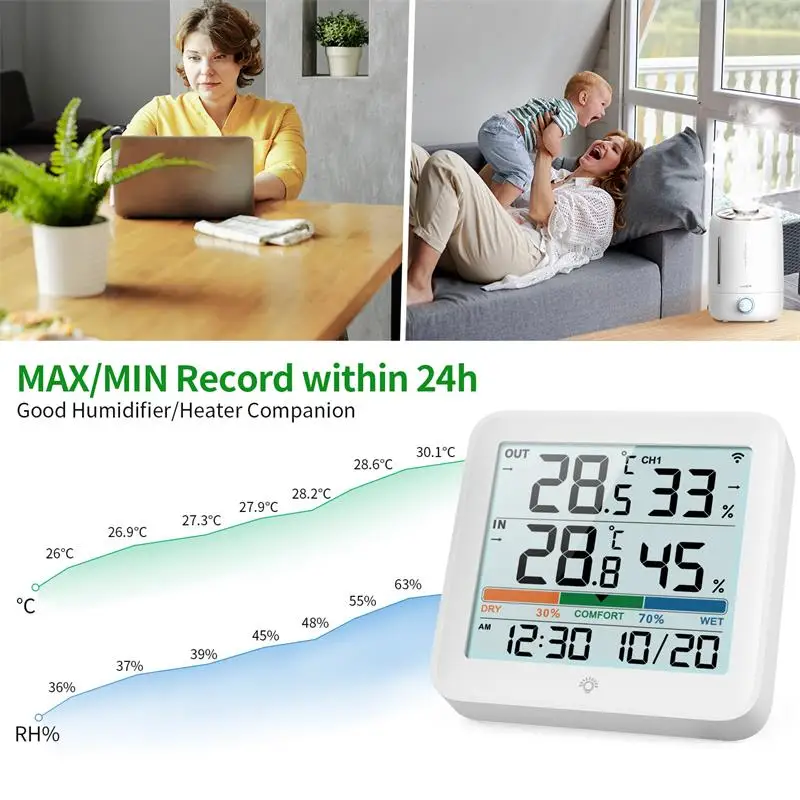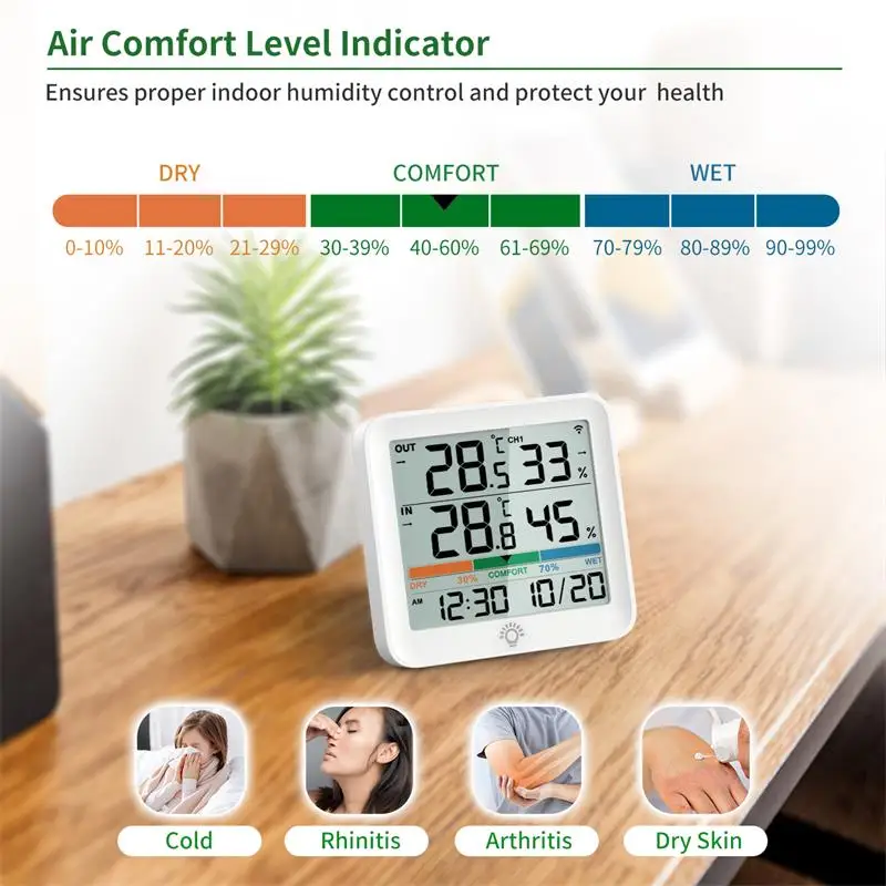 - 10-second refresh delivers fast, accurate data: indoor 14°F–140°F (-10°C–60°C), outdoor -40°F–70°F (-40–158°F), humidity 10–95% with ±1°C and ±3–5%RH.